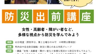 防災出前講座講座・イベント詳細チラシチラシPDFとき依頼者と相談(日時についてご相談ください)講座内容・講義「女性・高齢者・障がい者など多様な視点から防災を学んでみよう」・ワーク(クロスロードゲーム、きょうとみんなの防災カード等)・その他(令和5年度防災連続講座受講生による防災情報発信ツールの紹介等)ところ各地域の集会所や公民館等、または、もりおか女性センター* 会場は依頼者が確保してください。対象町内会や自主防災組織、防災に関心のある市民グループ費用等無料(ただし、会場までの交通費については実費負担をお願いいたします)申し込み方法電話:019-604-3303開催予定日の2か月前までにお申込...