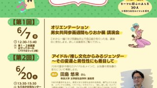 ジェンダー論講座「LOOK at MOYAMOYA 2026」イベント詳細 男女共同参画の基礎を学び、現状と課題を知り、ジェンダーギャップを埋めるにはどうすればよいかを考える講座です。今年度は、男性学の視点で、社会に根深く残るジェンダー構造を知った後、音楽文化を題材に無意識に作られたジェンダーバイアスや、ルッキズムについて知ることで、自分らしく生きるためにはどうしたらよいのか考えます。チラシチラシPDFとき【第1回】6月7日(日曜)12時30分から15時40分・ジェンダー論講座オリエンテーション 12時30分から13時15分 ・講演会&アフターミニイベント 13時30から15時...